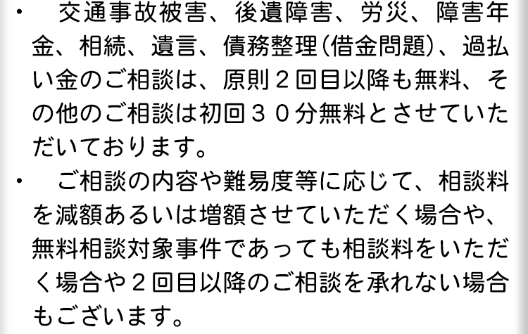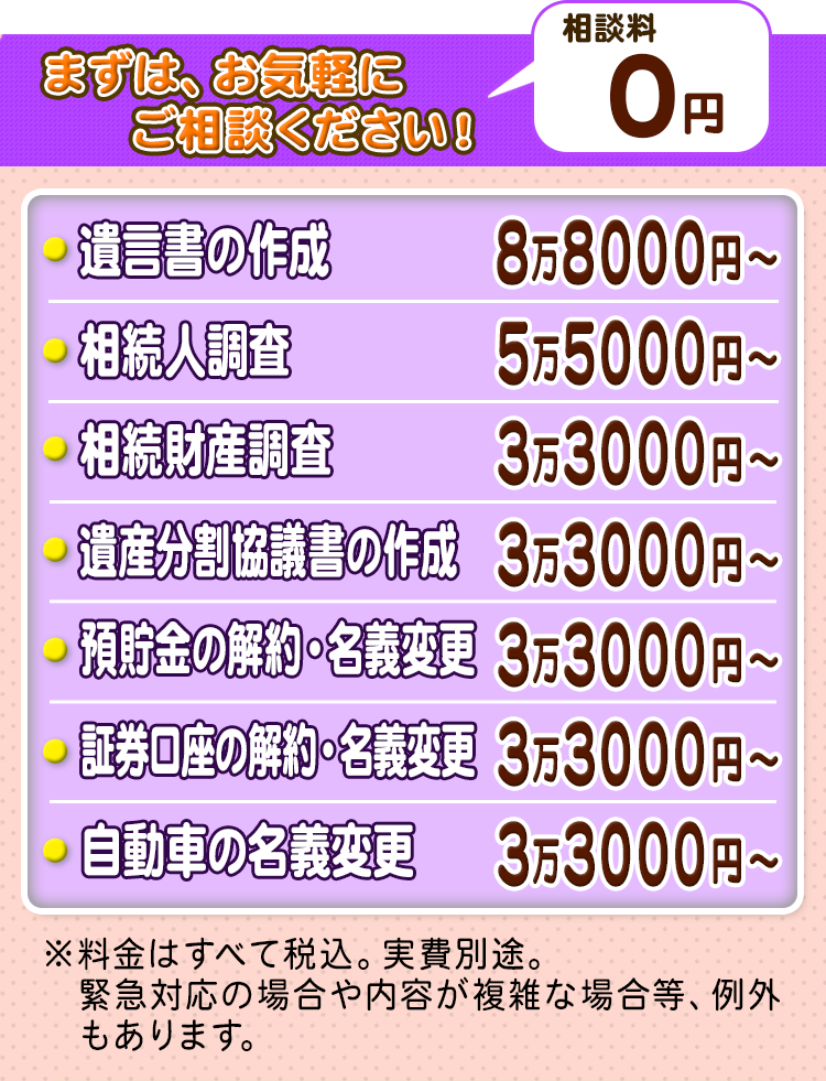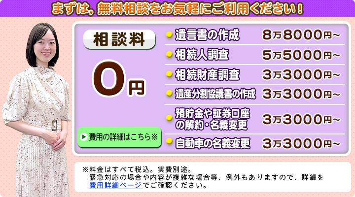 無料でご相談を承っておりますので(例外等もありますので、詳しくは料金ページをご確認ください。)、川崎で相続手続きのご相談をお考えの方は、当法人までお気軽にご相談ください。