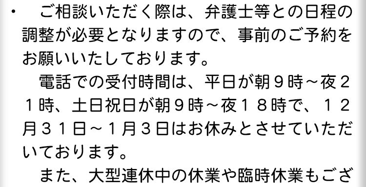 ご相談のお申込みは、こちらのフリーダイヤルまたはメールフォームにて受け付けております。ご相談内容を簡単に伺い、行政書士とのご相談の流れについてご案内いたします。