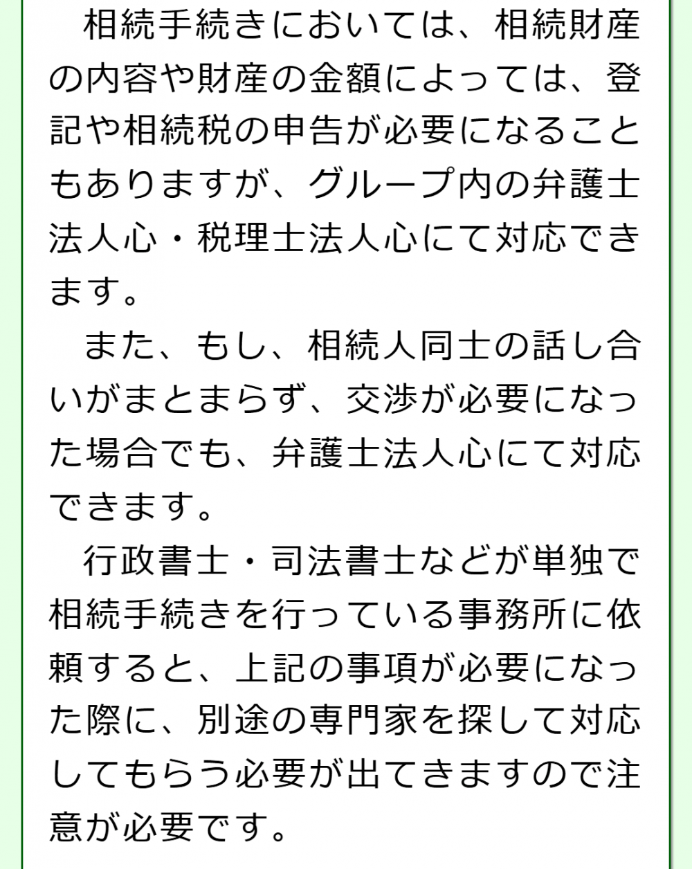 さらに、グループ企業に在籍する他士業と連携し、弁護士法人心や税理士法人心にて、遺産分割のトラブル解決や相続税申告など、相続手続きに関連するお悩みについても対応が可能です。