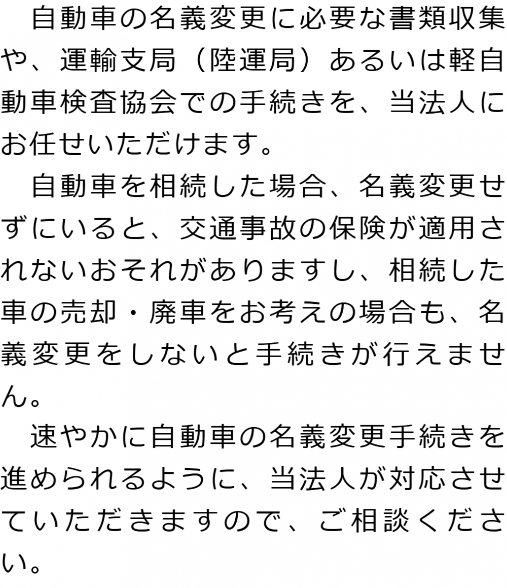 トップ業務内容自動車の名義変更 階層構造▼ 業務内容(目次) 自動車の名義変更 業務内容(目次)業務内容トップ行政書士法人心の業務内容遺言遺産整理相続人調査相続財産調査遺産分割協議書の作成預金・貯金の解約・名義変更証券口座の解約・名義変更自動車の名義変更心グループのその他の業務内容家族信託・民事信託節税対策事業承継遺言の検認相続放棄限定承認遺産分割遺留分侵害額請求相続登記相続税申告相続税調査 受付時間 平日 9時~21時、土日祝 9時~18時 夜間・土日祝の相談も対応します (要予約) 所在地 〒210-0006 神奈川県川崎市川崎区砂子1-7-4砂子平沼ビル5F 0120-2403-39 お問合せ・アクセス・地図
