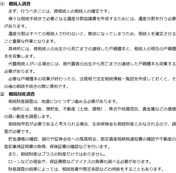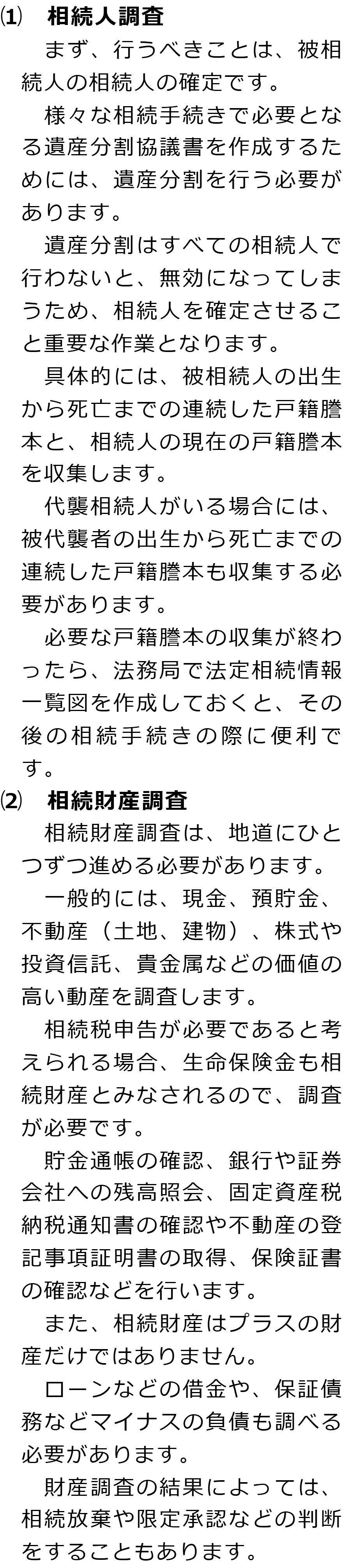 相続手続きの必要事項に関するQ&AQ相続手続きでは何をする必要がありますか?Q相続人調査と相続財産調査では何をする必要がありますか?Q遺産分割では何が必要ですか?Q相続登記はどのような場合に必要ですか?Q相続税申告はどのような場合に必要ですか? Q相続手続きでは何をする必要がありますか?AQ相続人調査と相続財産調査では何をする必要がありますか?AQ遺産分割では何が必要ですか?AQ相続登記はどのような場合に必要ですか?AQ相続税申告はどのような場合に必要ですか?A Q&A(目次)Q&Aトップ相続手続きの必要事項に関するQ&A 受付時間 平日 9時~21時、土日祝 9時~18時 夜間・土日祝の相談も対応します (要予約) 所在地 〒210-0006 神奈川県川崎市川崎区砂子1-7-4砂子平沼ビル5F 0120-2403-39 お問合せ・アクセス・地図