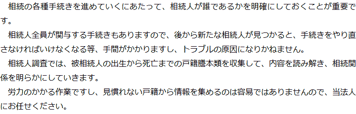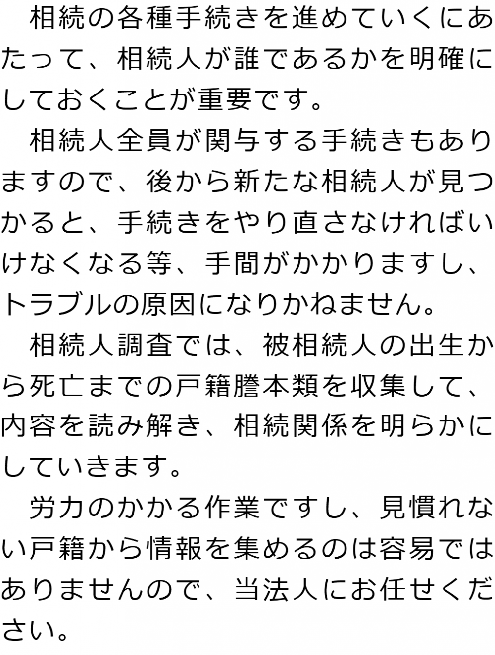 トップ業務内容相続人調査 階層構造▼ 業務内容(目次) 相続人調査 業務内容(目次)業務内容トップ行政書士法人心の業務内容遺言遺産整理相続人調査相続財産調査遺産分割協議書の作成預金・貯金の解約・名義変更証券口座の解約・名義変更自動車の名義変更心グループのその他の業務内容家族信託・民事信託節税対策事業承継遺言の検認相続放棄限定承認遺産分割遺留分侵害額請求相続登記相続税申告相続税調査 受付時間 平日 9時~21時、土日祝 9時~18時 夜間・土日祝の相談も対応します (要予約) 所在地 〒210-0006 神奈川県川崎市川崎区砂子1-7-4砂子平沼ビル5F 0120-2403-39 お問合せ・アクセス・地図