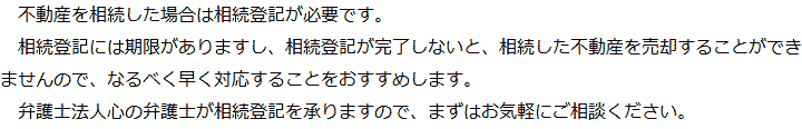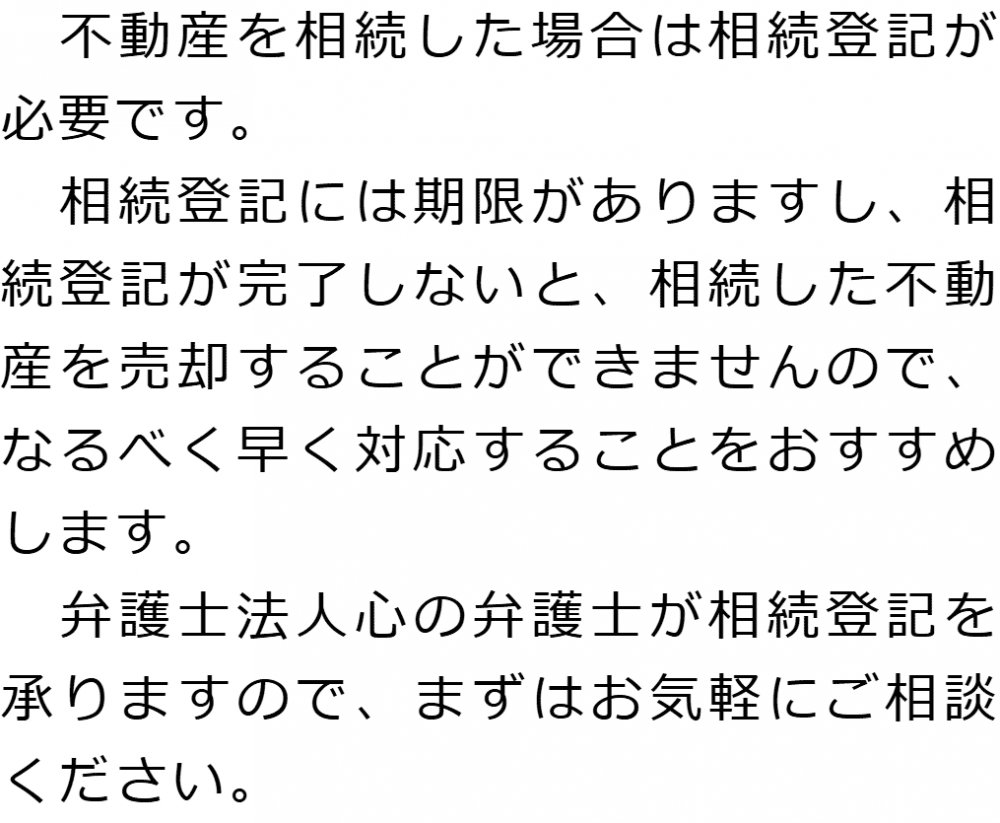 トップ業務内容相続登記 階層構造▼ 業務内容(目次) 相続登記 業務内容(目次)業務内容トップ行政書士法人心の業務内容遺言遺産整理相続人調査相続財産調査遺産分割協議書の作成預金・貯金の解約・名義変更証券口座の解約・名義変更自動車の名義変更心グループのその他の業務内容家族信託・民事信託節税対策事業承継遺言の検認相続放棄限定承認遺産分割遺留分侵害額請求相続登記相続税申告相続税調査 受付時間 平日 9時~21時、土日祝 9時~18時 夜間・土日祝の相談も対応します (要予約) 所在地 〒210-0006 神奈川県川崎市川崎区砂子1-7-4砂子平沼ビル5F 0120-2403-39 お問合せ・アクセス・地図